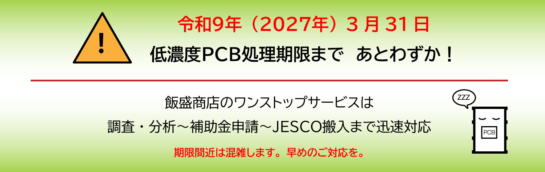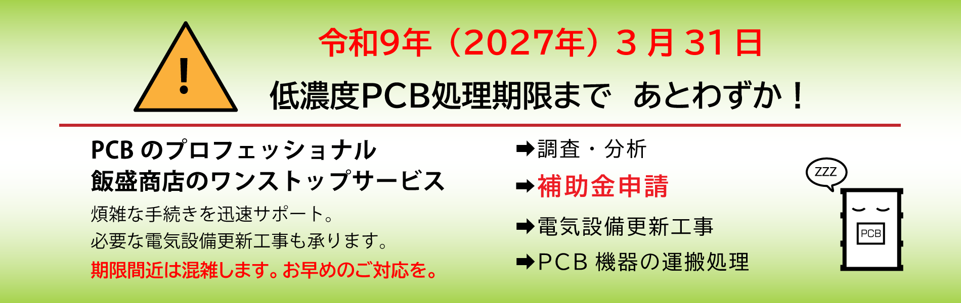 変電設備に関する工事、PCBの取扱い、SF6ガスの回収・破壊サービスなど、次世代に通じる産業廃棄物処理に力をいれています。